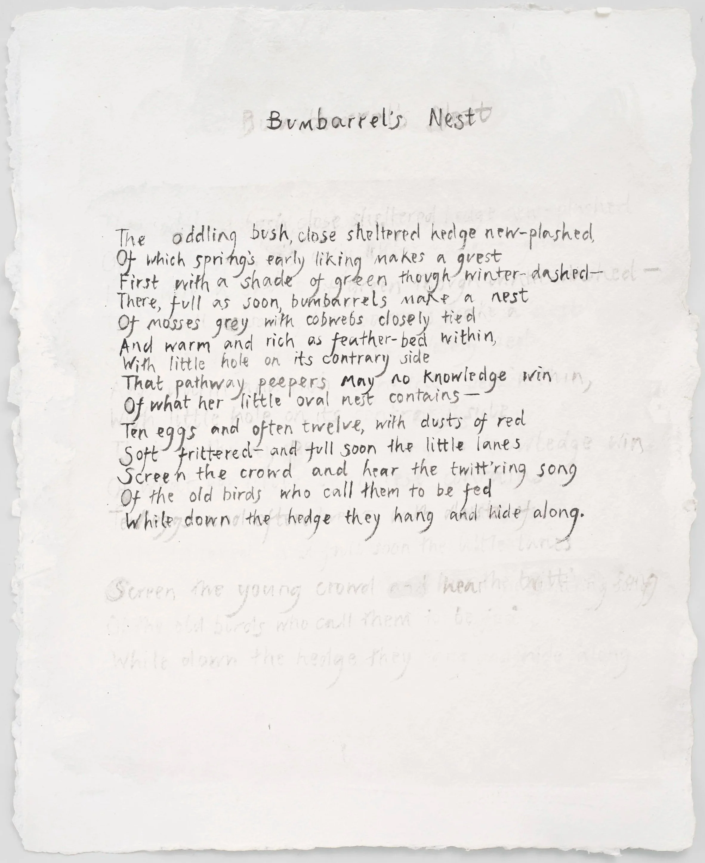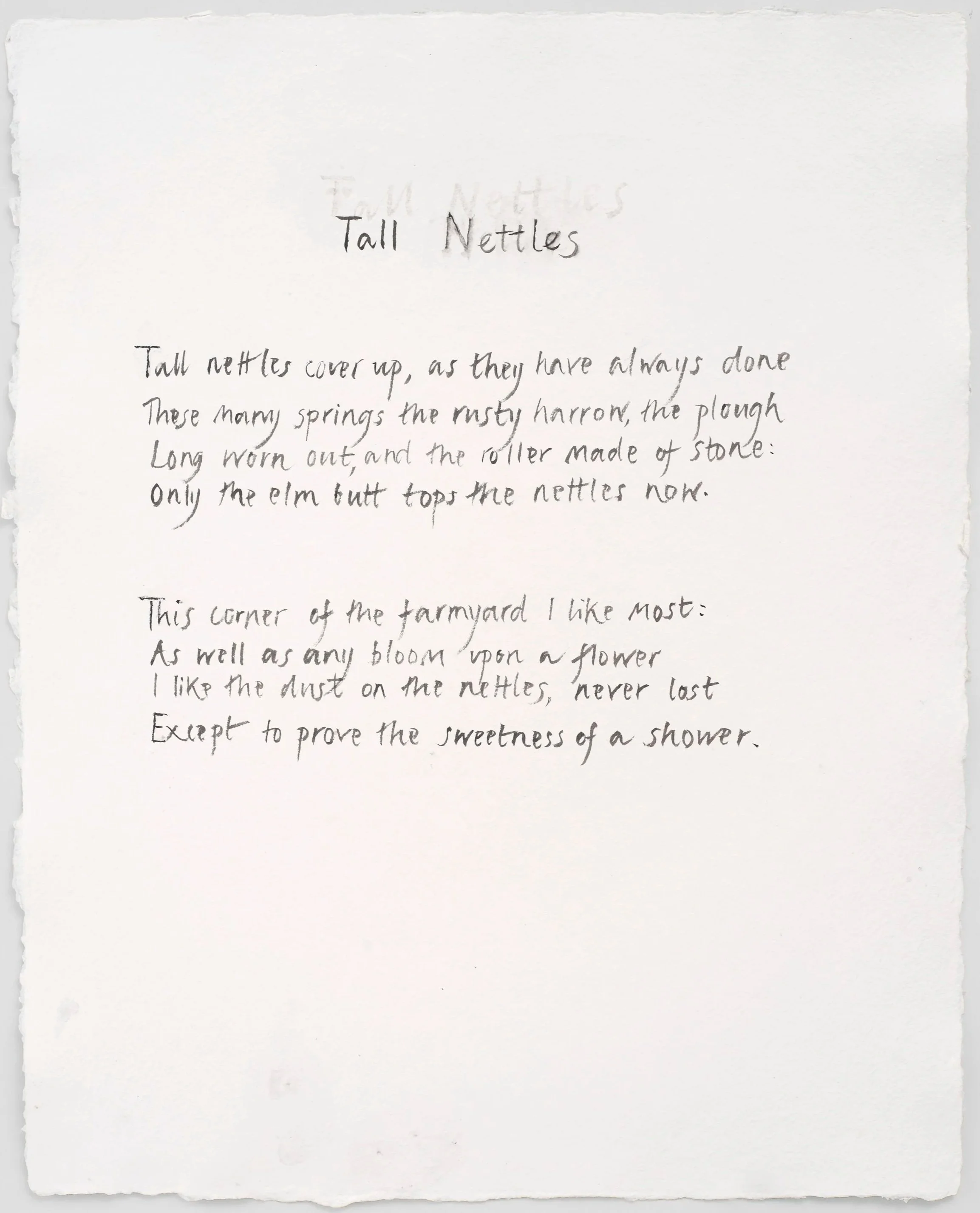 Twelve new watercolour paintings of poems are placed on mantelpieces through the exhibition. The poems have been chosen by the artist to recall particular seasons. The process of writing them out in paint, with a brush, is similar to her observational watercolours. Over time each letter is scrutinised, the form on the paper considered and numerous corrections remain visible. The language of the poetry is intended to ease the viewer into the mind of each season as they pass through the rooms.